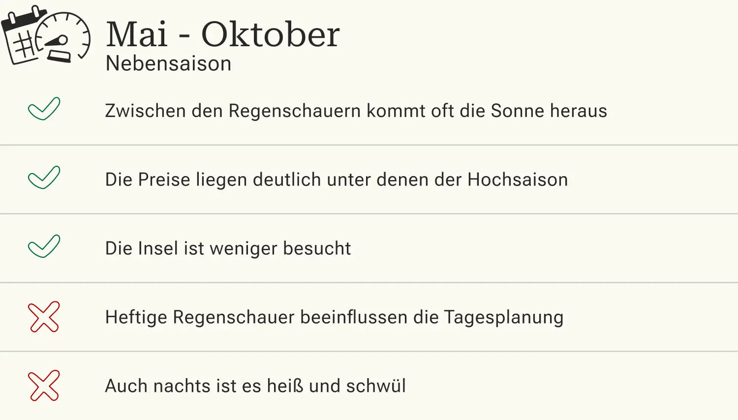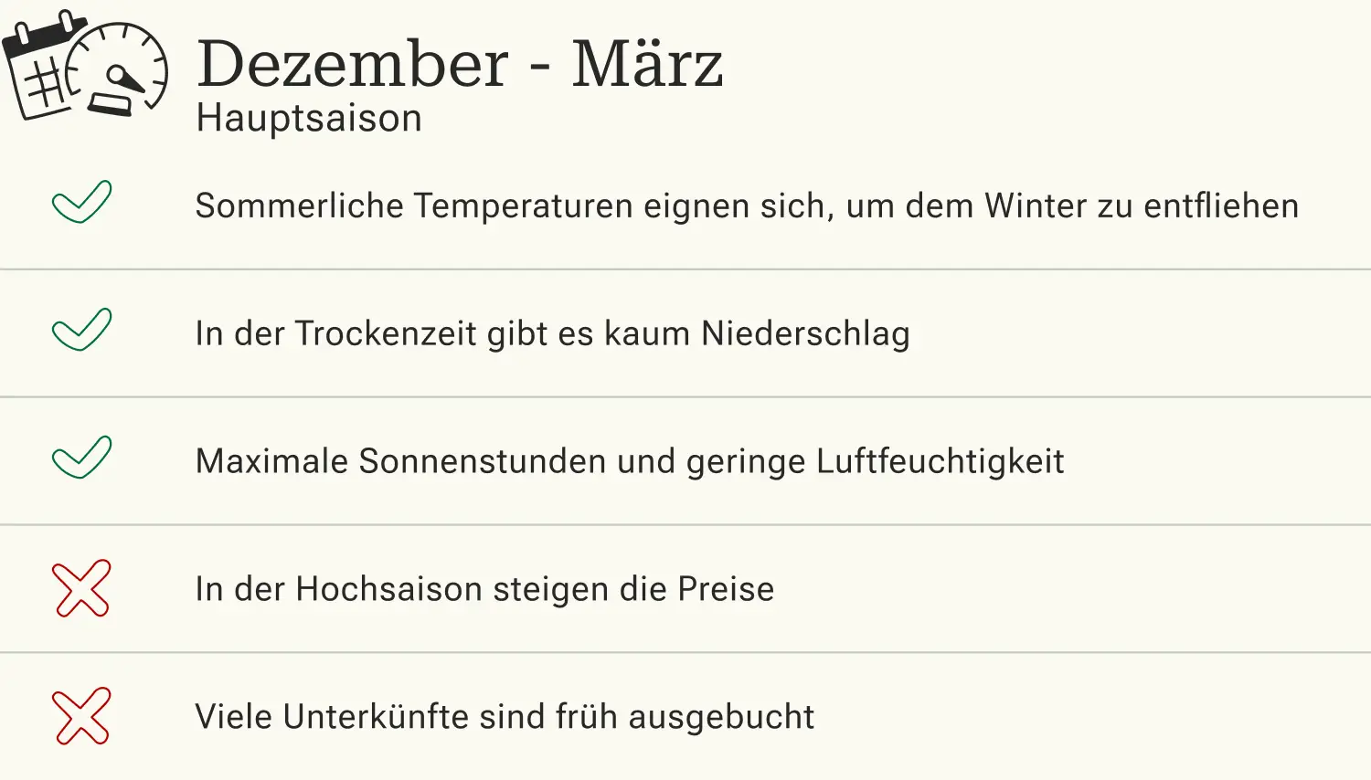 Da zum Ende und Beginn der Regenzeit, also im November und im April, das Wetter schon wechselhaft sein kann, sind vor allem die Monate Dezember bis März wettertechnisch als beste Reisezeit bekannt. Dies sorgt aber auch dafür, dass vor allem um die Feiertage zwischen Ende Dezember und Anfang Januar absolute Hochsaison herrscht, die mit hohen Preisen und starker Auslastung einhergeht. Wer gutes Wetter und weniger Andrang bevorzugt, kommt zwischen Januar und März.