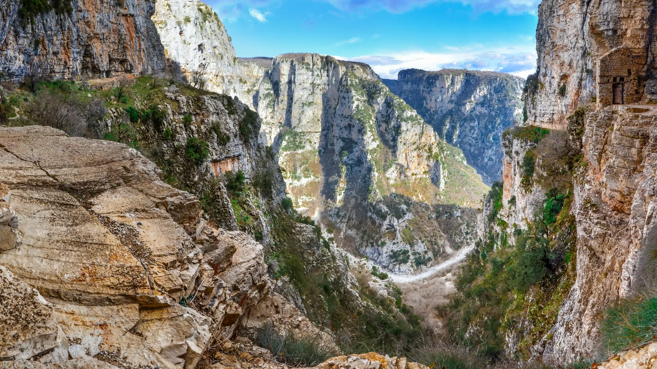Auf ins Abenteuer! Die Vikos-Schlucht ist ein Beispiel für eine Naturlandschaft, die man in Griechenland nicht erwarten würde: Die Umgebung ist von schneebedeckten Gipfeln, kristallklaren Bächen und Flüssen geprägt und liegt eingebettet im Nationalpark Pindos Nord.