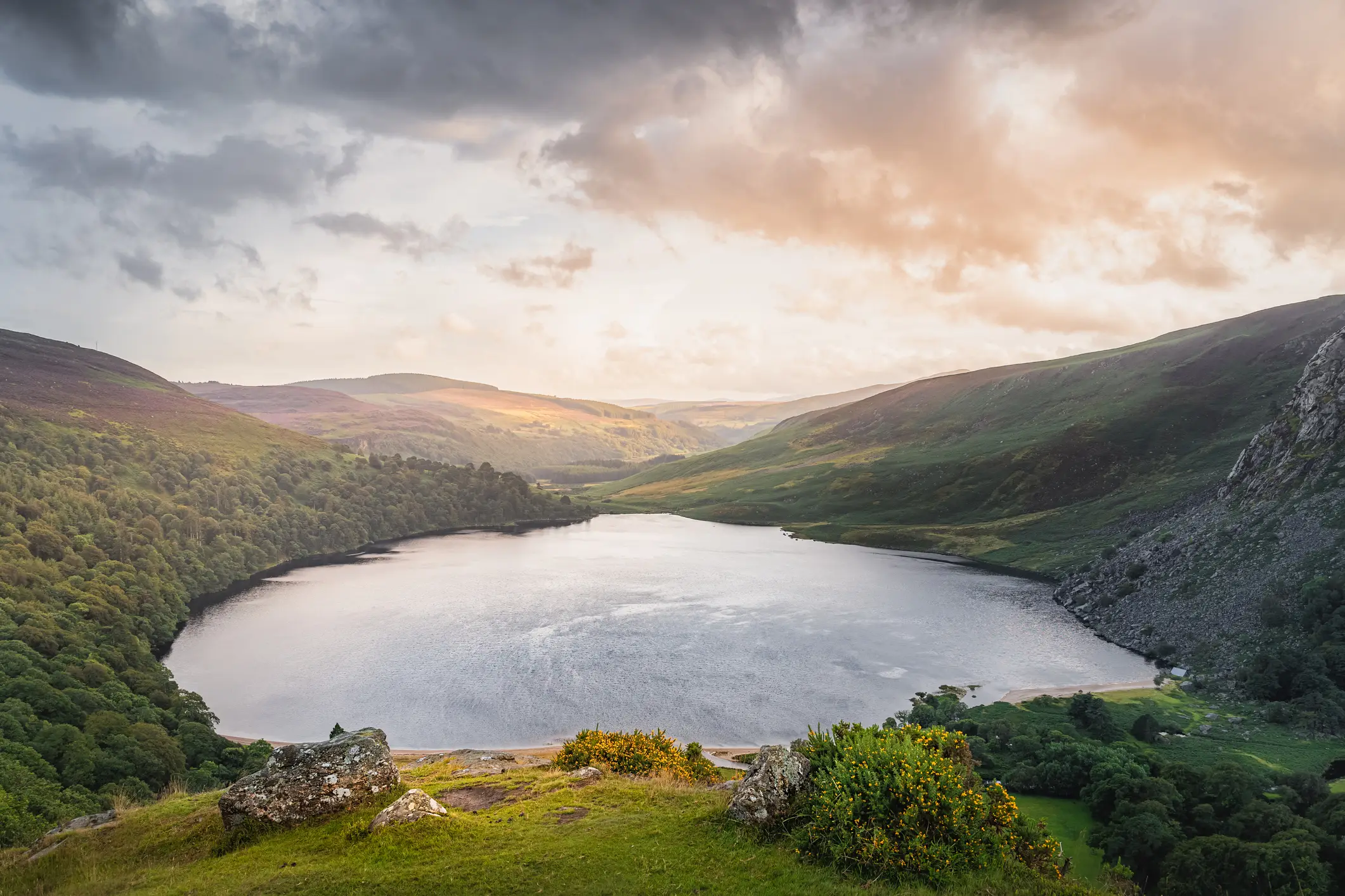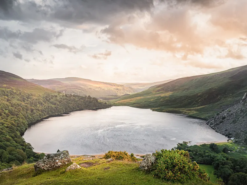 Die Wicklow Mountains in Irland sind ein Naturschutzgebiet südlich von Dublin voll von klaren Gletscherseen, weitläufigen Hügeln und tiefen Tälern. Es gibt zahlreiche Wander- und Radwege, wobei der Wicklow Way der berühmteste Fernwanderweg durch die Berge ist. Zum Herbst wechselt die buschige Landschaft in ein schönes Rot, was vor allem bei Sonnenuntergang ein fantastisches Bild ergibt.