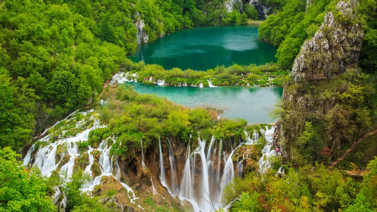 Der Nationalpark Plitvicer Seen befindet sich im zentralen Teil des Landes und gilt als eines der schönsten Naturwunder der Welt. Insgesamt 16 verschiedene Seen mit kristallklarem Wasser und riesige, rauschende Wasserfälle machen den Ort zu einem wahren Highlight für Naturliebhaber.