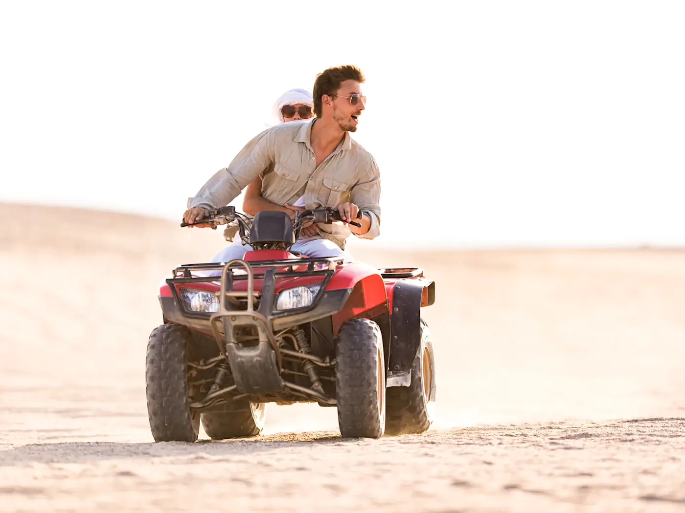 Bei einer Quad-Tour düsen Sie durch die charakteristischen roten Dünen und erfahren die Wüste auf abenteuerliche Weise. Während Sie über die Dünen fahren und sich den Wind um die Nase wehen lassen, sehen Sie die Kameldornbäume, die die Wüstenlandschaft prägen und Tierspuren im Sand.