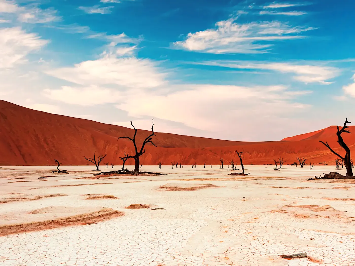 Sossusvlei ist ein einzigartiges Wüstengebiet in Namibia, bekannt für seine beeindruckenden Sanddünen, darunter die berühmte Düne 45 oder Big Daddy, die mit 325 Metern höchste Düne der Welt. Die Düne 45 ist bei Touristen sehr beliebt und bietet die Möglichkeit, früh morgens den Gipfel zu erklimmen, um den spektakulären Sonnenaufgang über den roten Dünen zu erleben. In der Umgebung von Sossusvlei befindet sich auch die Deadvlei, eine ausgetrocknete Salzpfanne mit bizarren, vertrockneten Akazienbäumen, die eine surreale und einzigartige Landschaft schafft, die Fotografen und Naturliebhaber gleichermaßen fasziniert.