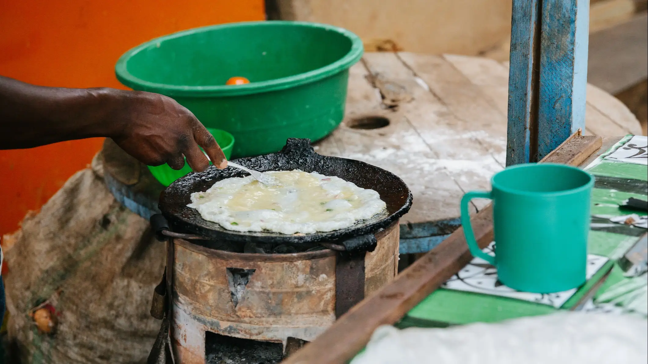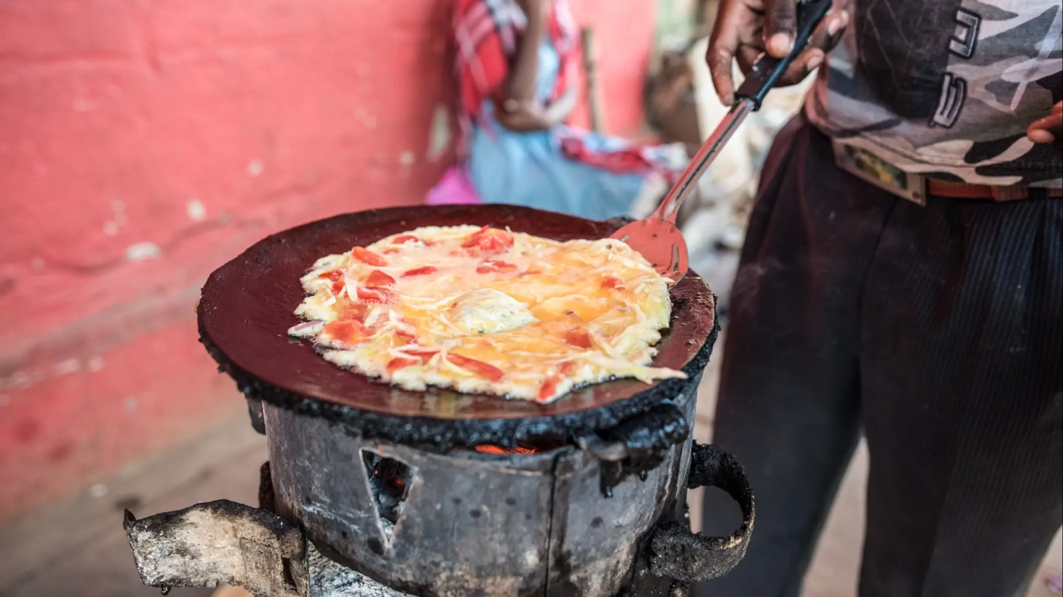 Der Teig besteht aus Weizenmehl, wird zu einem dünnen Pfannkuchen geformt, mit Hackfleisch und rohem Ei gefüllt, dann zu einem Päckchen gefaltet und auf einer heißen Platte gebraten. Die Eier bekommen eine geschmeidige, pochierte Konsistenz, wenn sie sich mit dem Hackfleisch vermischen – ein Genuss für jeden.