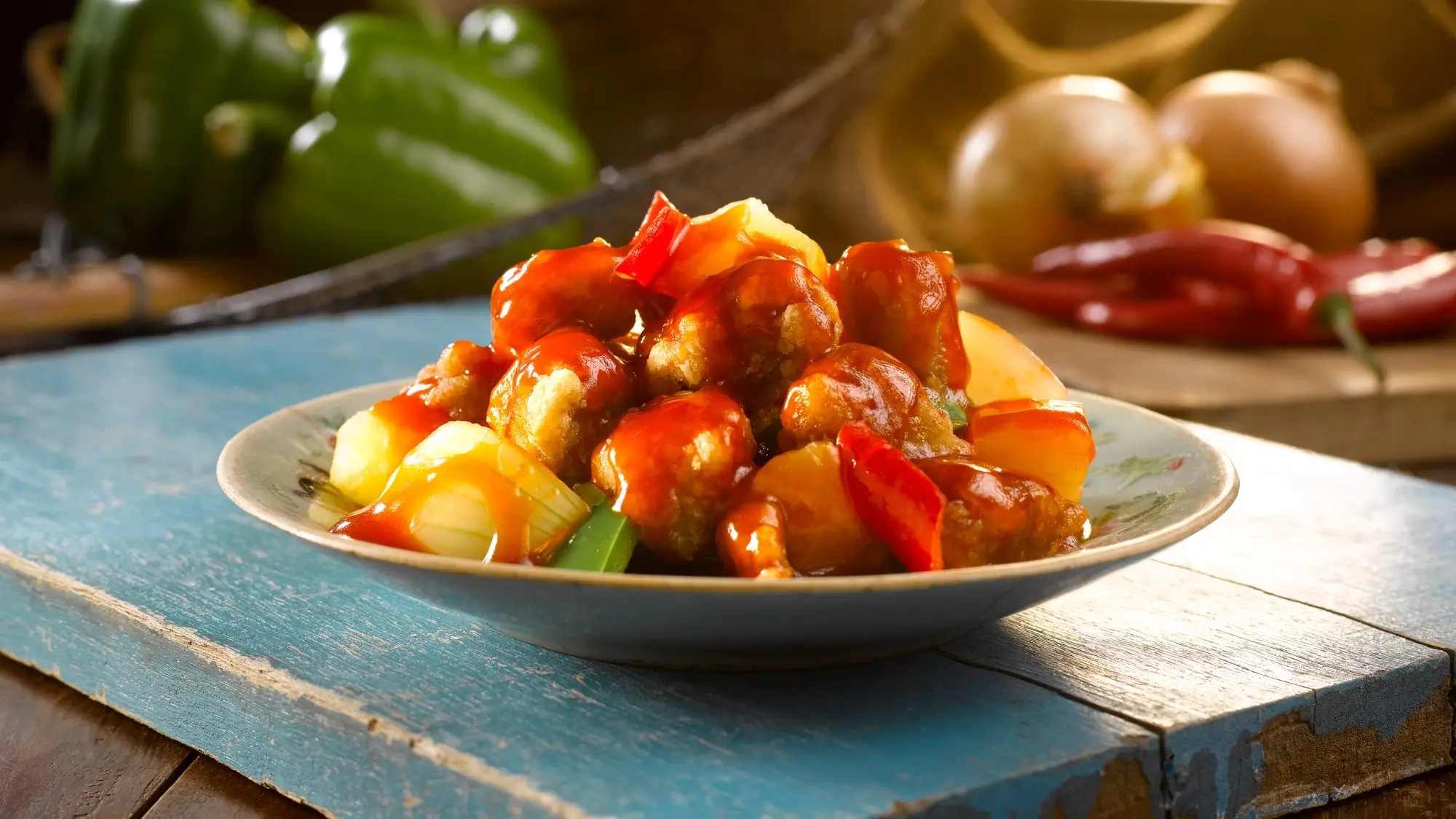 Oft werden Paprika und Ananas hinzugefügt, um dem Gericht zusätzliche Textur und Geschmack zu geben. Im Laufe der Zeit entstanden verschiedene Variationen, um unterschiedliche Vorlieben zu bedienen – heute kann das Schweinefleisch auch durch Hühnchen, Rindfleisch oder Schweinerippchen ersetzt werden.