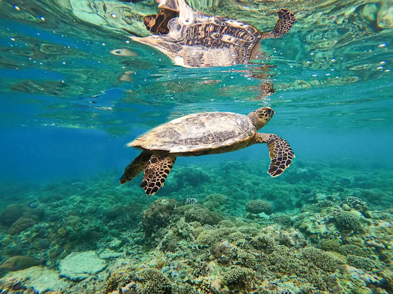 Während Gili Trawangan die größte und lebhafteste der Gili Inseln ist, ist Gili Meno die kleinste und ruhigste. Hier herrscht eine romantische Stimmung, die man gut bei einem Spaziergang genießen kann: Um dabei die gesamte Insel zu durchqueren, braucht man nur circa zwei Stunden. Neben der ruhigen, romantischen Atmosphäre sind die Tauchspots die Hauptattraktion der Insel. Für Taucher gibt es hier Korallenriffe, um die sich bunte Fische tummeln, die versunkene Seebrücke Bounty und eine Unterwasserskulptur zu sehen.
