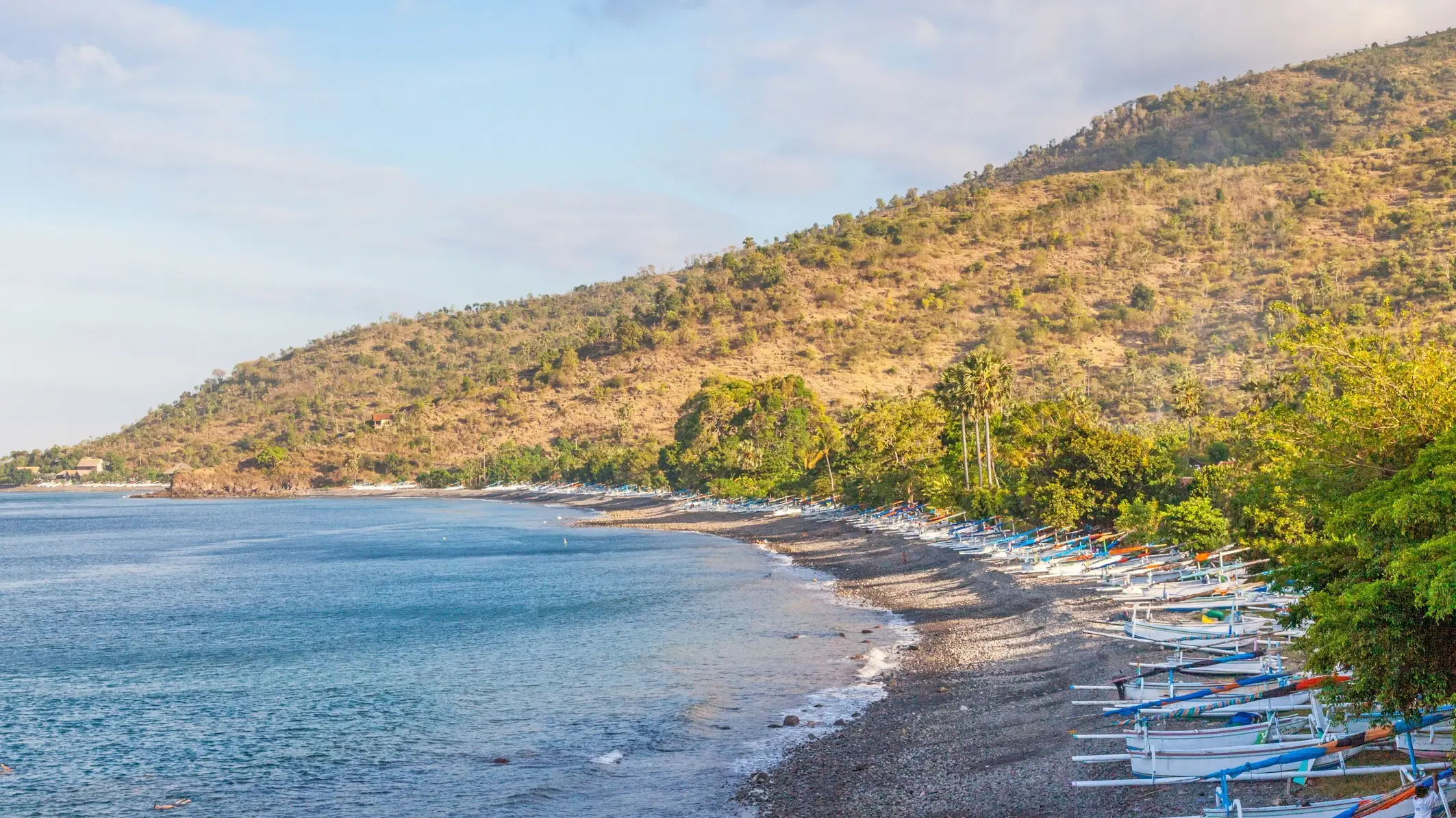 Der Amed Beach liegt an der Ostküste von Bali und begeistert mit seinem schwarzen Sand aus Vulkangestein und kleinen Kieseln. Darüber hinaus zieht er Besucher vor allen Dingen aufgrund der entspannten Atmosphäre und des einzigartigen Blicks auf den Vulkan Gunung Agung an.