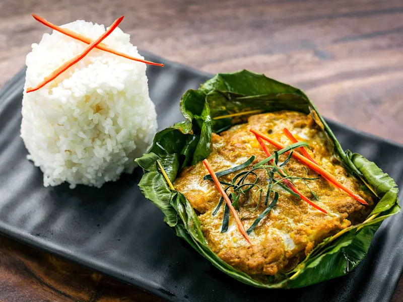 Diese wird wiederum mit Palmzucker, Eiern, Fischsoße und Kokosmilch vermischt und ummantelt zartes Fischfilet, das anschließend in Bananenblättern gedämpft wird. Traditionell wird es in kleinen, aus Bananenblättern geformten Schalen serviert und von Reis begleitet. Richtig zubereitet ist der Fisch seidenweich und schmilzt im Mund.