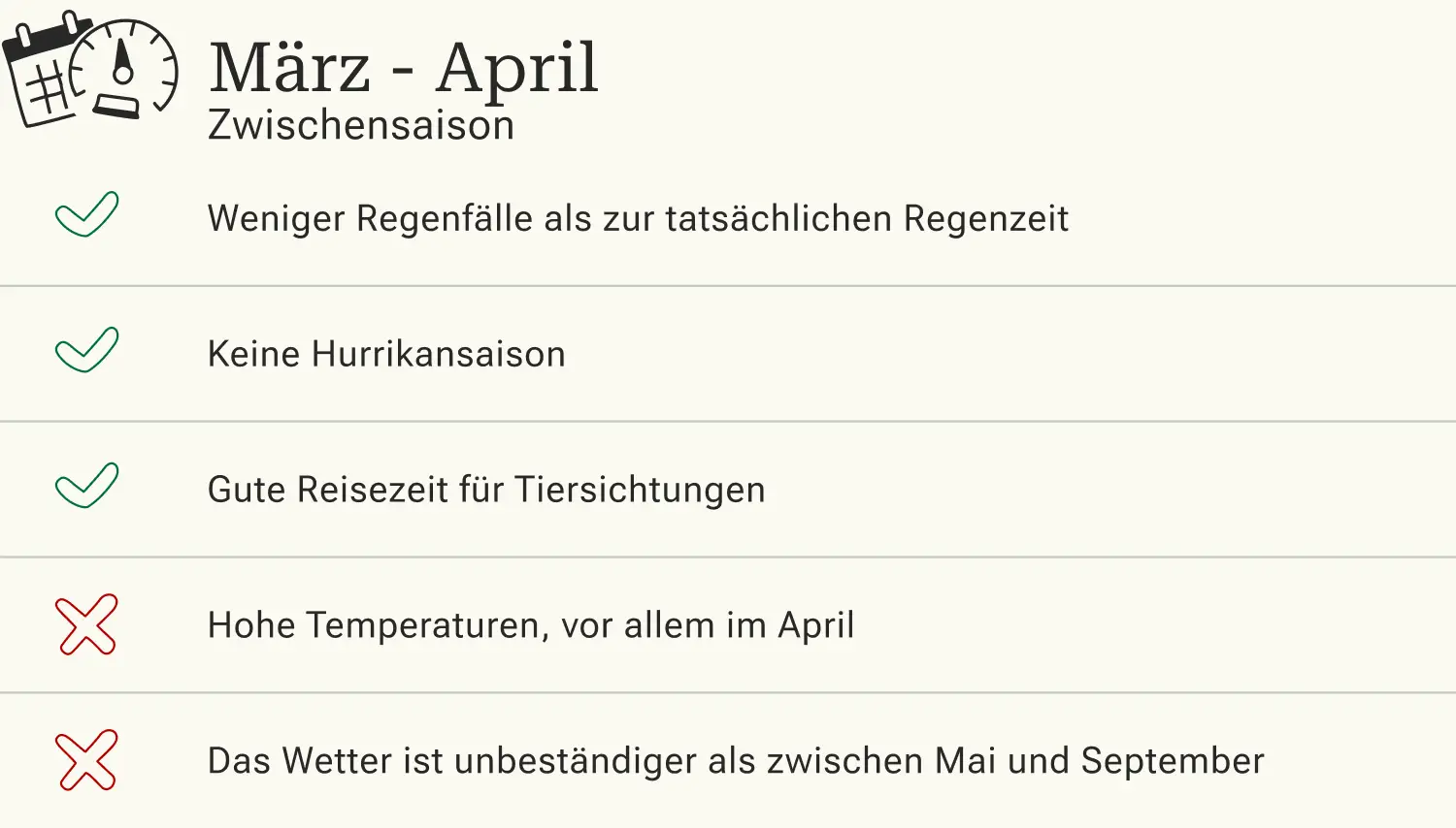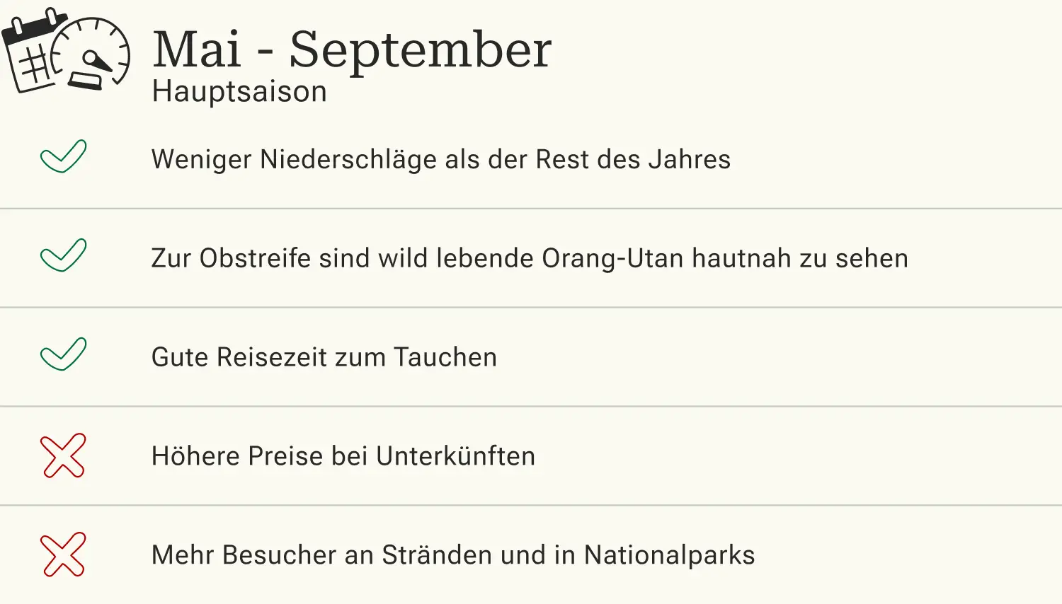 Die beste Reisezeit für Borneo ist in der Trockenzeit. Innerhalb dieser ist von Mai bis September touristische Hochsaison. Dementsprechend kann es an den Stränden und in den Nationalparks voller werden. Unterkunstpreise steigen und Buchungen müssen im Voraus getätigt werden. Das Wetter ist weniger regnerisch, womit Dschungeltouren und Wanderungen nichts im Wege stehen. Da jetzt das Obst reif ist, stehen die Chance gut, wild lebende Orang-Utans aus der Nähe zu betrachten. Sie verlassen die Baumkronen, um die Früchte zu sammeln.
