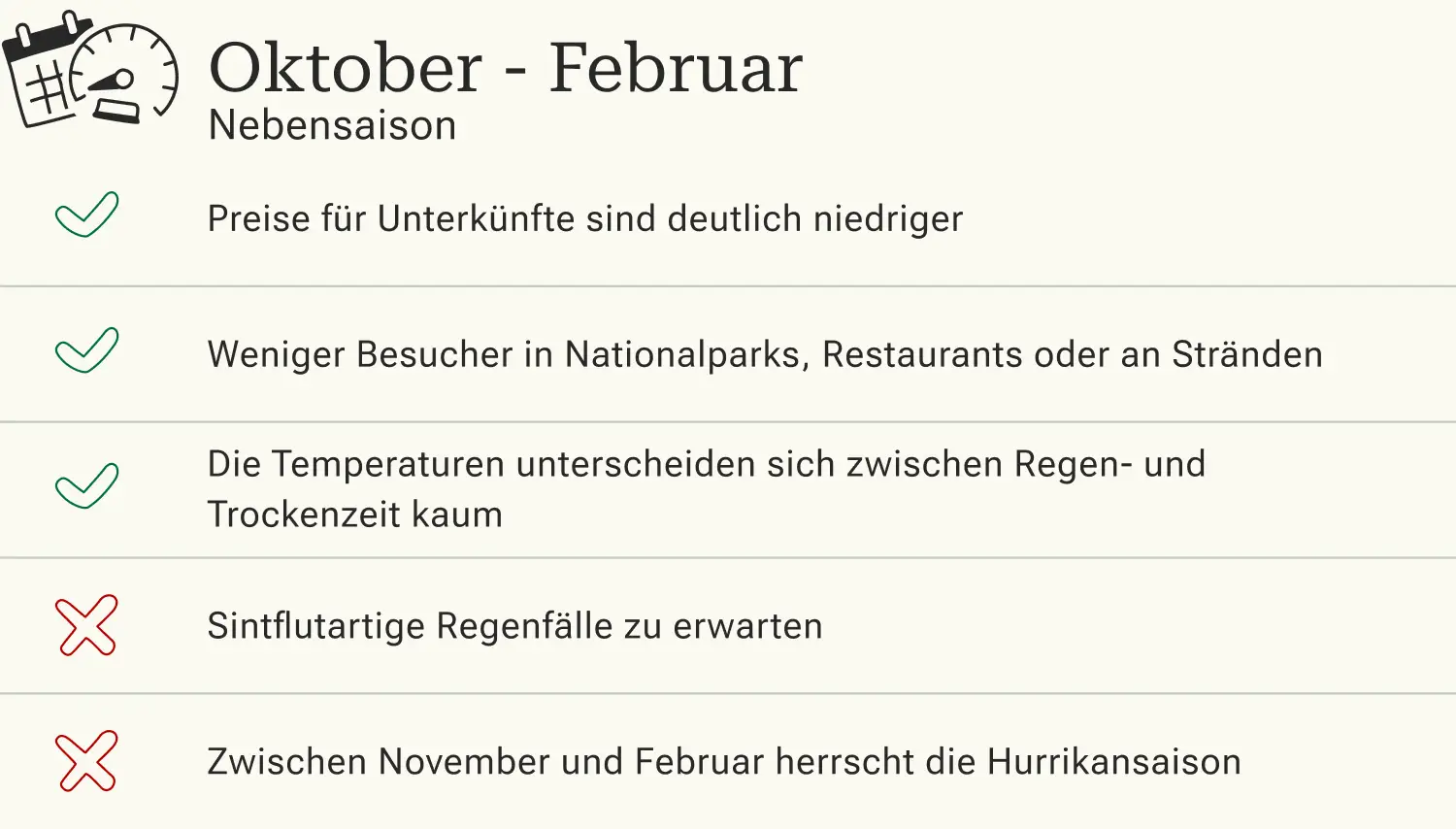 Nebensaison ist auf Borneo von Oktober bis Februar, dann erreichen die Niederschläge das Maximum an Häufigkeit und Intensität. Das Reisen ist jetzt mühsam und die Infrastruktur leidet unter den Regenfällen. Zur Hochzeit der Regenzeit fallen die Schauer sintflutartig und es gibt kaum Regenpausen. Zudem ist zwischen November und Februar auch Hurrikansaison. Zu den Niederschlägen gesellen sich dann heftige Stürme und es ist Vorsicht geboten, da umfallende Bäume oder umherfliegende Gegenstände zur Gefahr werden können.