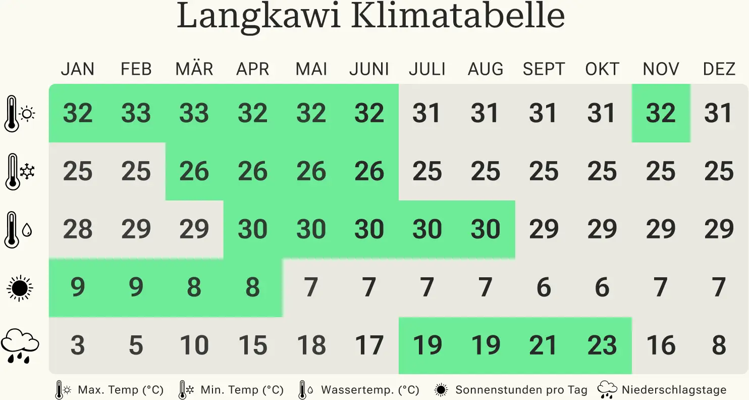 Die beste Reisezeit, um die Trauminsel Langkawi in Malaysia zu besuchen, ist von Januar bis März, sowie Juni bis August. Denn nun besticht das Inselklima mit hohen Temperaturen und nur wenig Niederschlägen. Durchschnittstemperaturen von rund 30 °C, angenehme Wassertemperaturen und viele Sonnenstunden versprechen nun einen unvergesslichen Urlaub, sowie die Möglichkeit die zahlreichen Freizeitangebote auf der Insel voll auszukosten.
