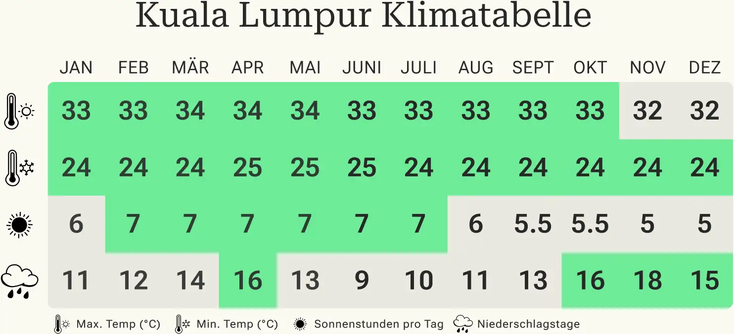 | Klimatabelle für Malaysia | Jan | Feb | März | Apr |