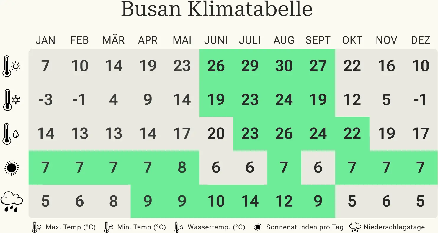 Grundsätzlich können Sie Busan das ganze Jahr über besuchen. Wer jedoch an den wunderschönen Sandstränden wie Gwangalli oder Haeundae Sonne tanken und baden möchte, sollte Reisepläne für die Sommermonate schmieden. Darüber hinaus bieten sich Reisen im Frühling und Herbst hervorragend an, um sowohl die charmante Hafenstadt als auch die Umgebung näher zu erkunden. Während im April die Kirschbäume in voller Blüte stehen, eignet sich das Wetter in Busan gerade im Oktober perfekt für entspannte Tage am Strand als auch für Wanderungen und Sightseeing.