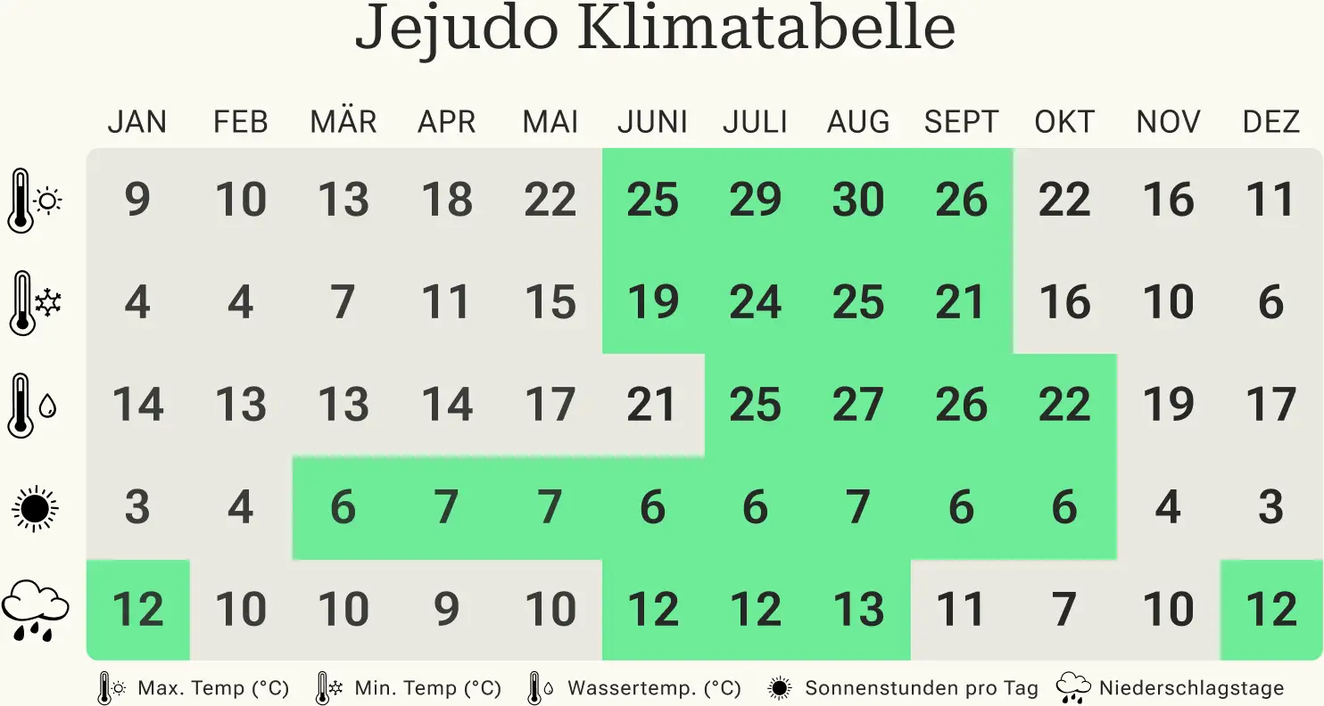 Obwohl die tropische Insel Jeju im Süden des Landes ein ganzjähriges Reiseziel ist, gelten der Frühling und Herbst als beste Reisezeit. Denn während es in den warmen Sommermonaten unzählige Touristen auf die Insel zieht, können Sie das malerische Eiland mitsamt seiner atemberaubenden Landschaften außerhalb der Hochsaison in aller Ruhe erkunden. Profitieren Sie dabei von angenehmen Temperaturen um die 20° C und bis zu sieben Sonnenstunden pro Tag. Allerdings sollten sich Besucher der Insel zum Frühlingsende und Herbstbeginn auf vereinzelte Schauer einstellen.