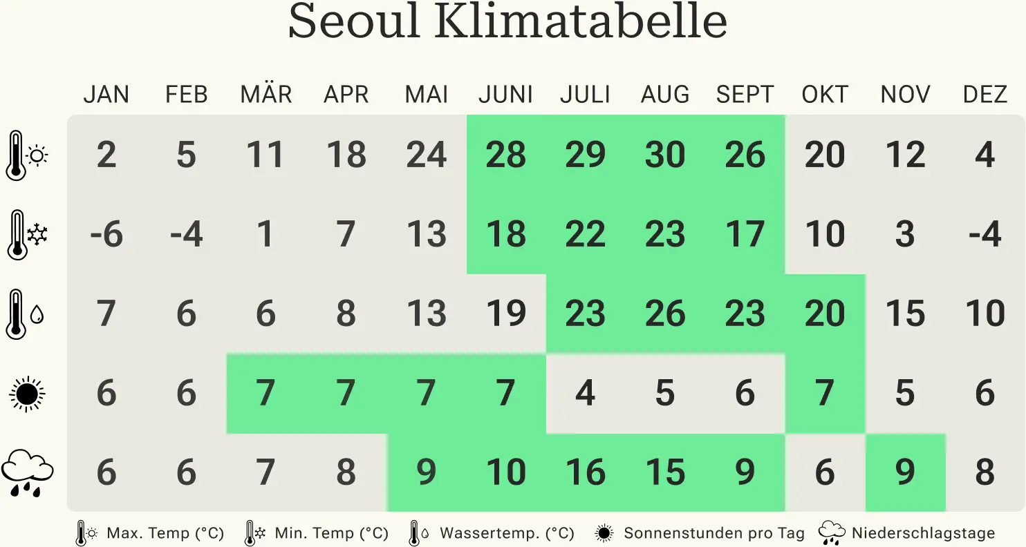 Weiter profitieren Sie bei Reisen im Frühling und Herbst in ganz Südkorea von bis zu sieben Sonnenstunden. Ideale Bedingungen also, um Städtetrips, Wandertouren und entspannte Tage an der Küste zu kombinieren. Trotz des guten Wetters sollten Sie allerdings mit vereinzelten Regenschauern rechnen. Passende Kleidung gehört daher unbedingt ins Reisegepäck.