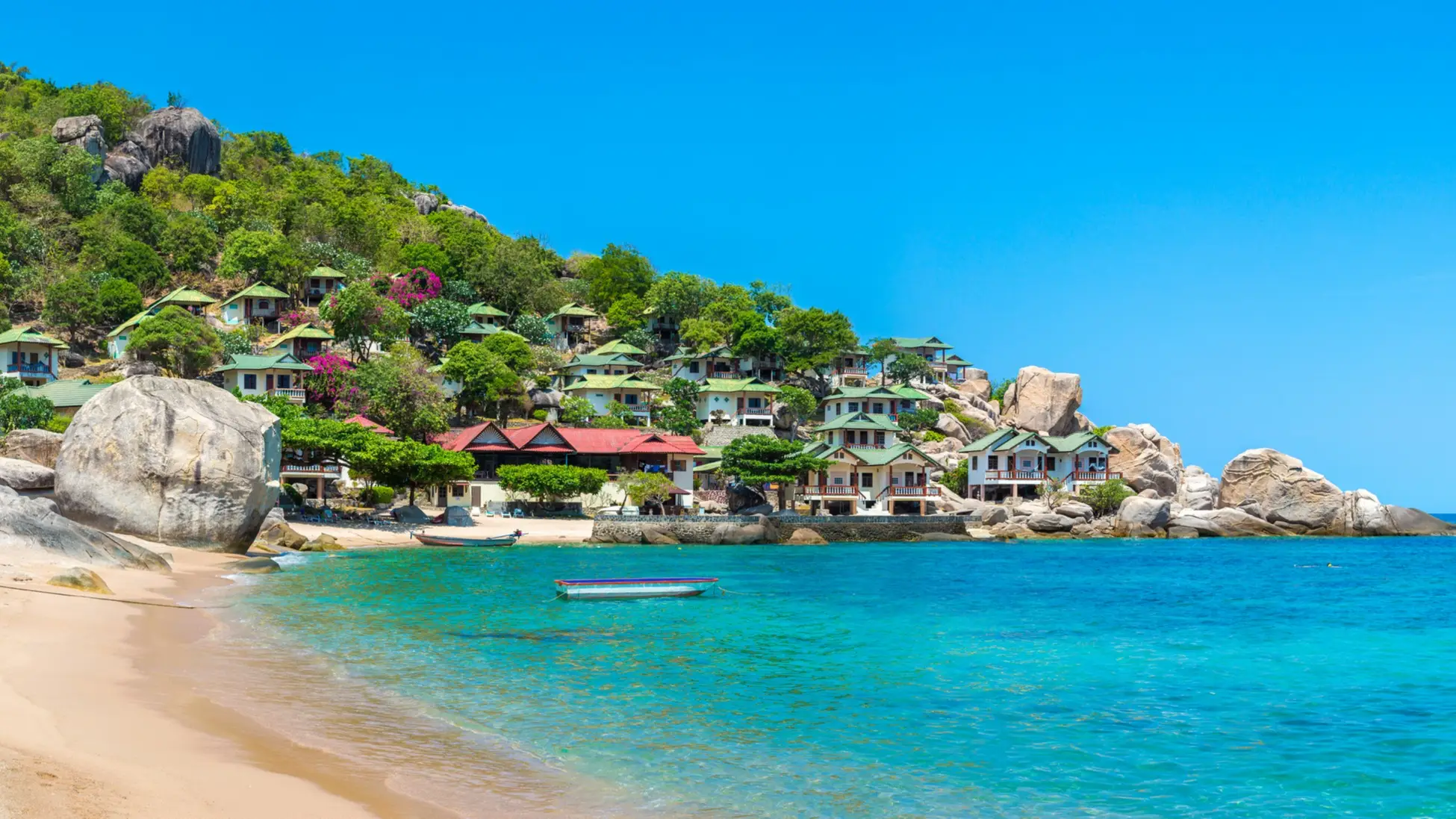 Die Ao Tanote Bay auf der thailändischen Insel Koh Tao ist ein toller Zufluchtsort. Die Kombination aus Sonne, weichem Sand und warmem Wasser sowie Kokospalmen, die die Hügel säumen, schafft eine tropische Kulisse, die Abgeschiedenheit ausstrahlt.