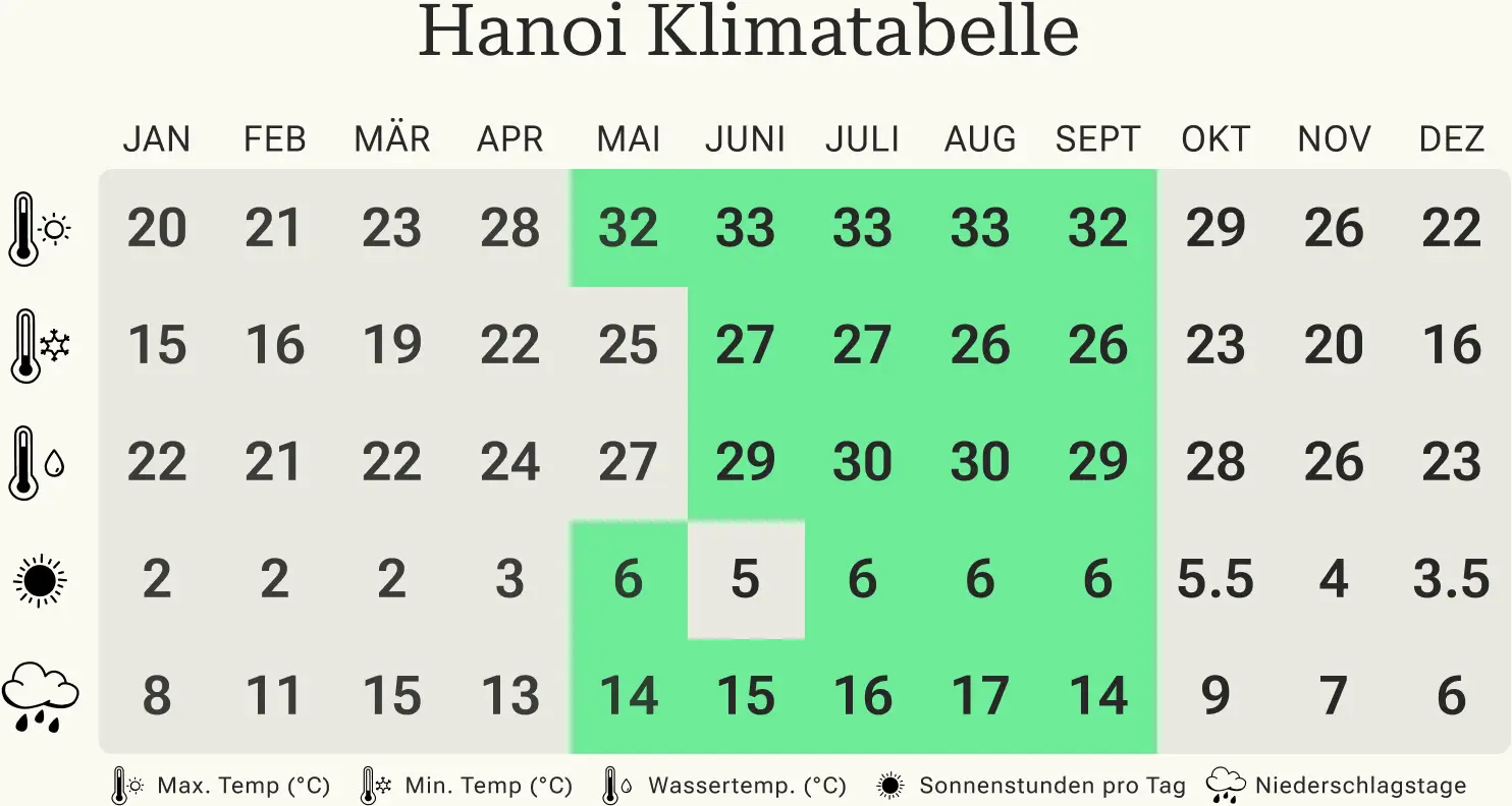 In der Tabelle sind Durchschnittswerte dargestellt, die auf den Klimadaten von Hanoi, Ho-Chi-Minh, Da Nang und Phu Quoc basieren.