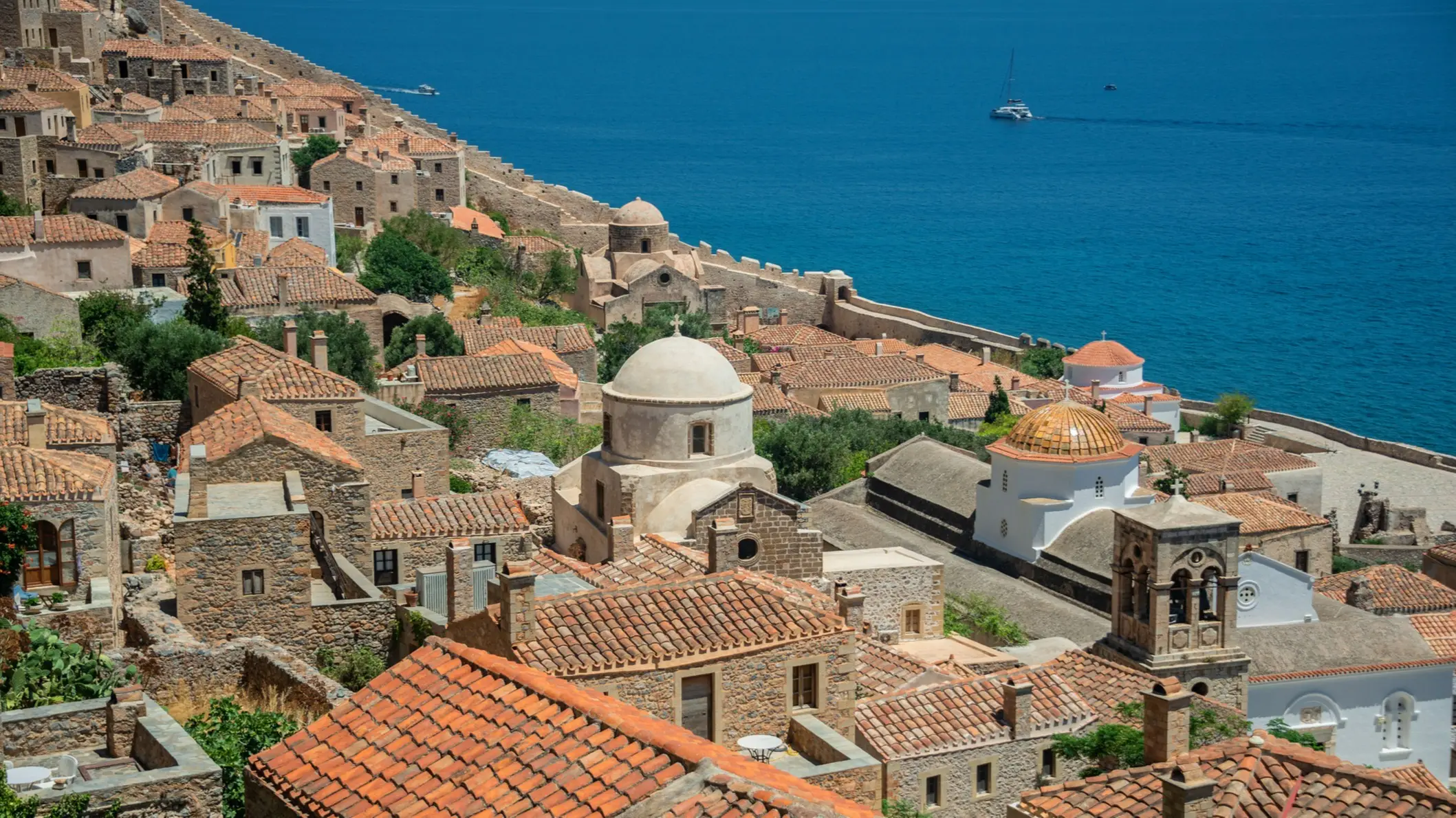 Sie erhob sich in einer äußerst günstigen Position, da sie vollständig von den Felsen geschützt und vom Meer aus völlig unsichtbar war. In Malvasia gibt es viel zu sehen: Es gibt Elkomenos Christos, eine schöne griechisch-orthodoxe Kirche und natürlich die alte Festungsstadt Kastros, von der aus man einen spektakulären Blick über die Dächer der Stadt und das Meer genießen kann.