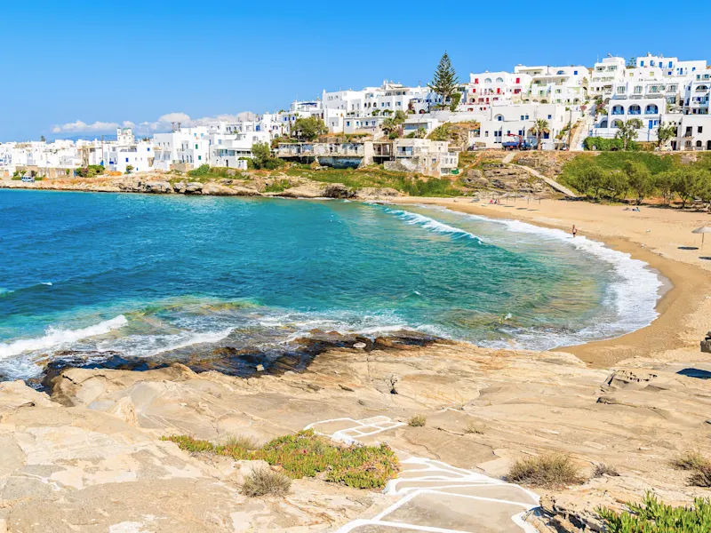 Lassen Sie sich von dem Kontrast zwischen den schneeweißen Häusern der Altstadt, dem kristallklaren Meer und der schroffen Natur der Insel verzaubern. Und verbringen Sie einen entspannten Badetag an dieser Paralia. Wer ausreichend Sonne getankt und gebadet hat, kann problemlos zurück nach Naoussa schlendern und sich in der charmanten Hafenstadt in einem der vielen Restaurants gastronomisch verwöhnen lassen.