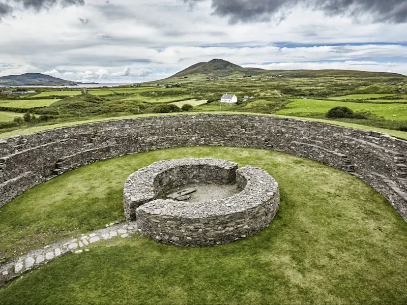 Das um circa 600 erbaute Cahergall Stone Fort ist eine von wenigen noch erhaltenen eisenzeitlichen Ringfestungen Irlands. Die Außenmauern sind bis zu 4 Meter hoch und können für einen spektakulären Blick auf die Atlantikküste über Steinstufen erklommen werden.