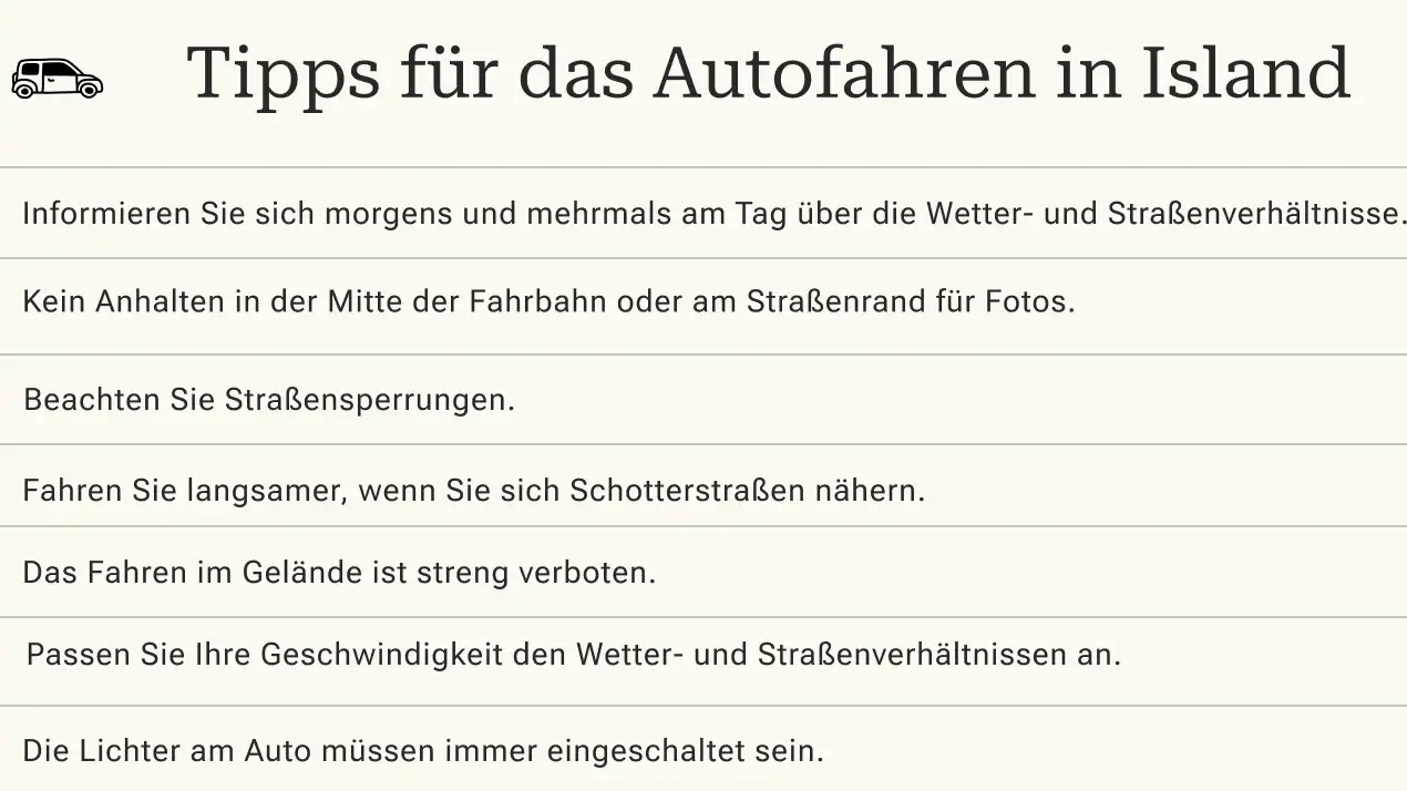 Vor allem im Hochland brauchen Sie für viele Straßen ein Allradfahrzeug. Denken Sie an die Lichtpflicht, das strikte Alkoholverbot und an Ihre Grüne Versicherungskarte. Bleiben Sie auf den gekennzeichneten Wegen, achten Sie auf Umweltbedingungen und vorbeilaufende Tiere. Behalten Sie zudem Ihren Benzinstand im Auge, da die nächste Tankstelle teilweise recht weit entfernt sein kann. Die meisten isländischen Tankstellen akzeptieren nur Debit- und Kreditkarten.