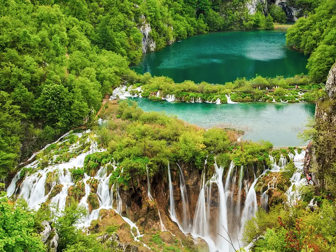 Der Nationalpark Plitvicer Seen befindet sich im zentralen Teil des Landes und gilt als eines der schönsten Naturwunder der Welt. Insgesamt 16 verschiedene Seen mit kristallklarem Wasser und riesige, rauschende Wasserfälle machen den Ort zu einem wahren Highlight für Naturliebhaber.