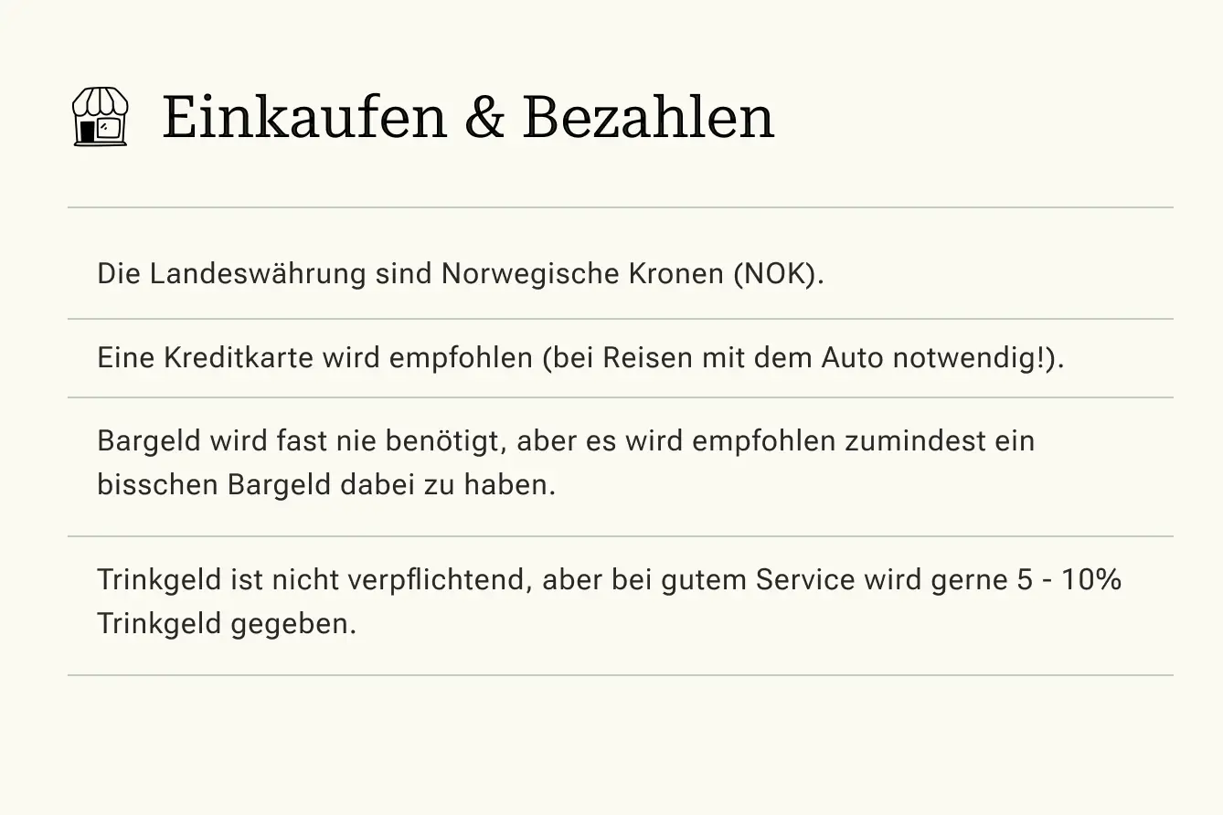 Nichtsdestotrotz ist es empfehlenswert ein bisschen Bargeld parat zu haben, da es manchmal bei abgelegeneren Orten vorkommen kann, dass sonst nur 'Vipps' (das norwegische Pendant zu Paypal) als Zahlungsart akzeptiert wird, was man als Ausländer nicht benutzen kann. Dies ist jedoch wirklich sehr selten der Fall. Trinkgeld ist nicht verpflichtend, wird aber ähnlich gehandhabt wie in Deutschland. Für guten Service wird gerne etwa 5 % - 10 % Trinkgeld gegeben, oder auf den nächsten vollen Betrag aufgerundet