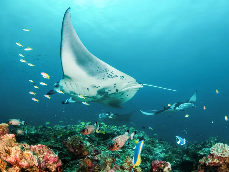 Vor Andros befindet sich das drittgrößte Barriereriff und Lagunensystem der Welt. Mit fast 200 Kilometern Länge gibt es hier jede Menge zu entdecken. Greifen Sie daher zu Schnorchel und Taucherbrille und erkunden Sie die kunterbunten Korallenriffe, weitläufigen Seegraswiesen, imposanten Steilwände, blauen Grotten sowie versunkenen Wracks in Ihrem eigenen Tempo.