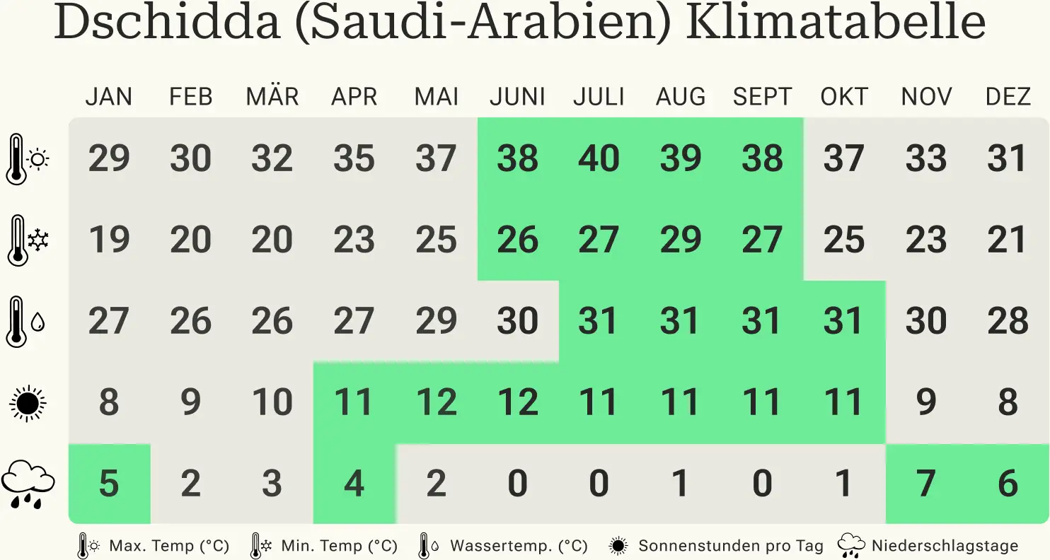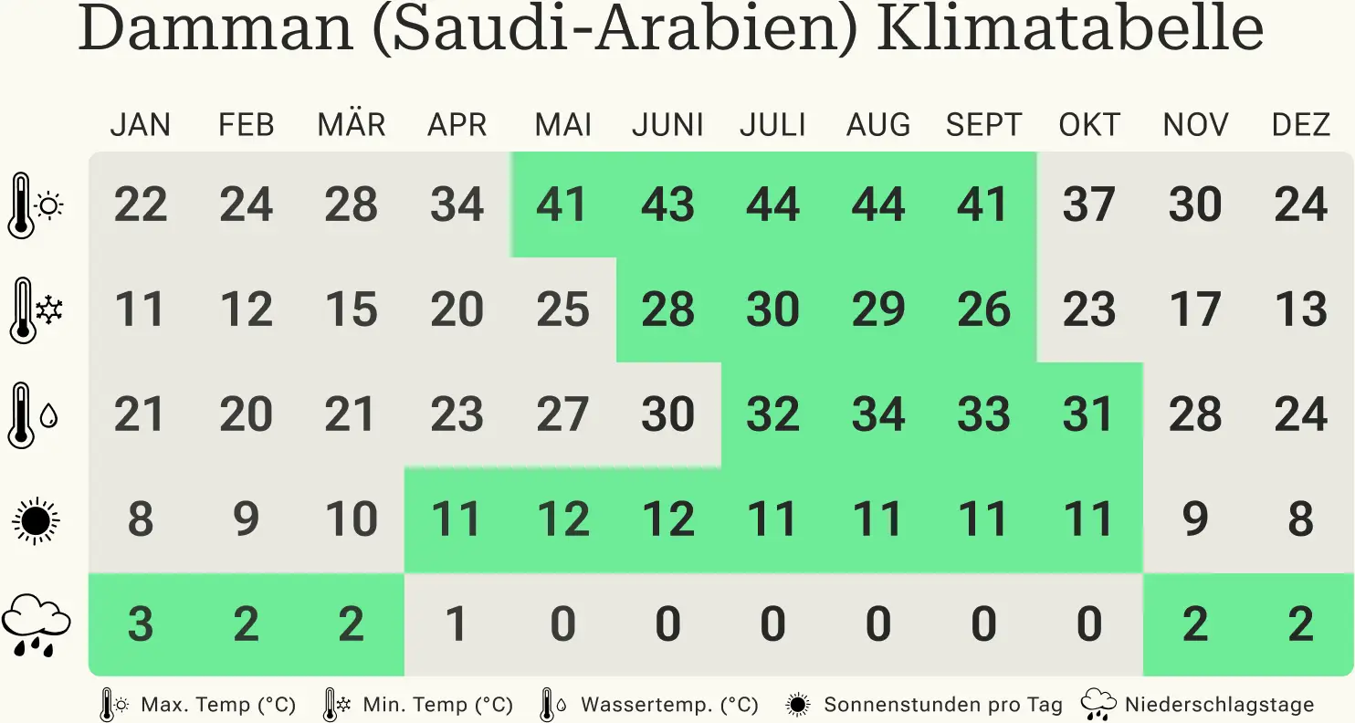 In der Tabelle sind Durchschnittswerte dargestellt, die auf den Klimadaten von Riad, Dschidda und Dammen basieren.
