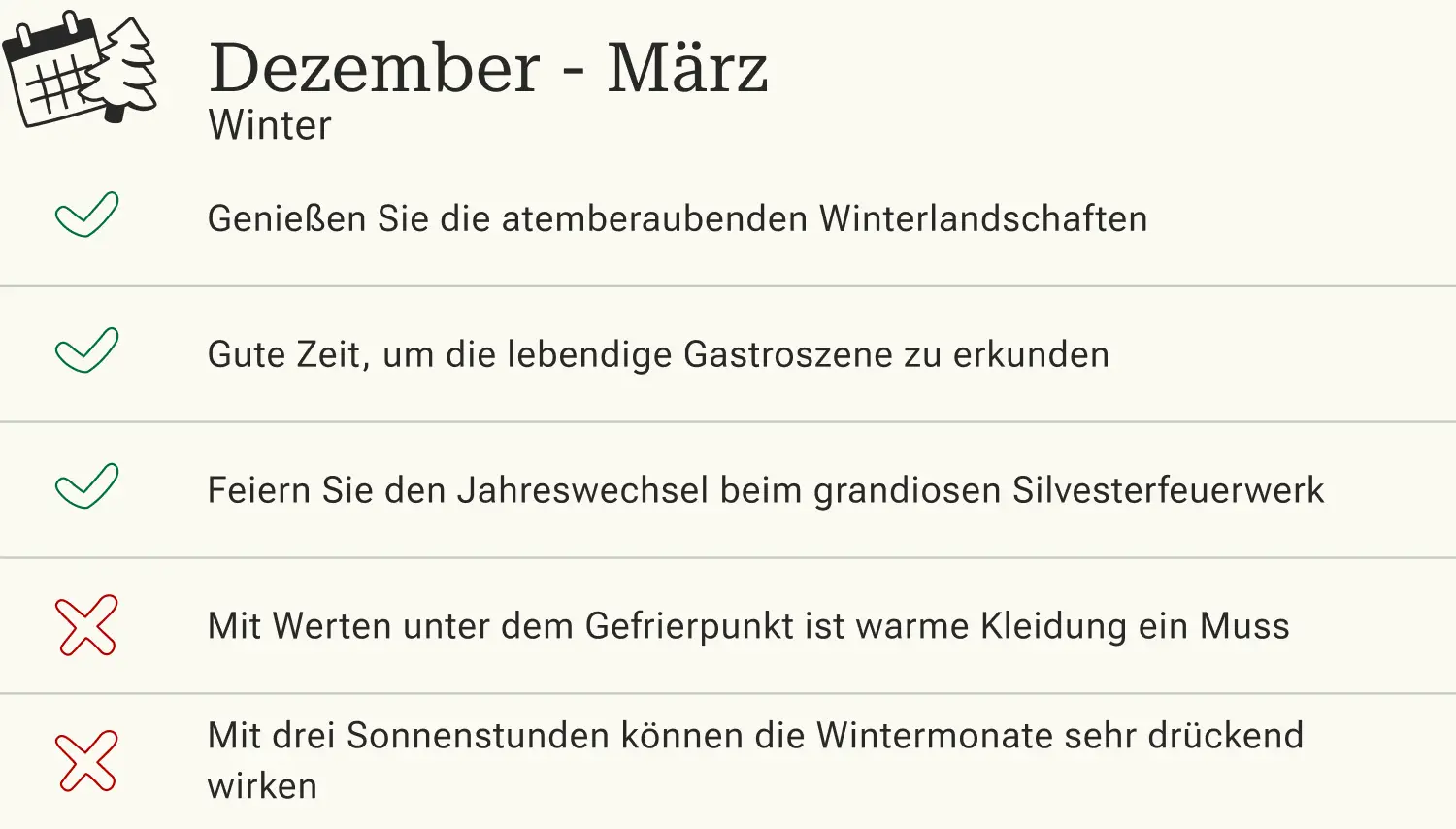 | Sonnenstunden pro Tag | 3 | 4 | 5 | 6 | 8 | 9 | 9 | 8 | 7 | 5 | 3 | 3 | |