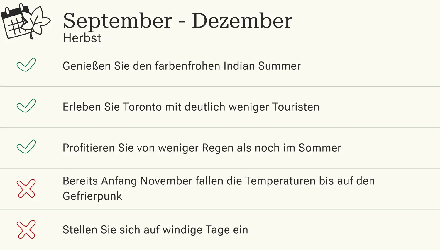 Im September sinken die Temperaturen in Toronto auf knapp über 20° C. Gleichzeitig nehmen sowohl die Sonnenstunden als auch die Regenwahrscheinlichkeit ab. Dennoch erwartet Reisende insbesondere zum Herbstanfang fantastisches Reisewetter in der Landeshauptstadt. Genießen Sie die kunterbunte Herbstlaubfärbung im High Park. Erleben Sie den Indian Summer bei einer unvergesslichen Radtour um den Ontariosee. Oder besuchen Sie ab Ende November einen der herrlichen Weihnachtsmärkte der Stadt. Da die Temperaturen nachts deutlich sinken, gehört nun ausreichend warme Kleidung ins Reisegepäck.