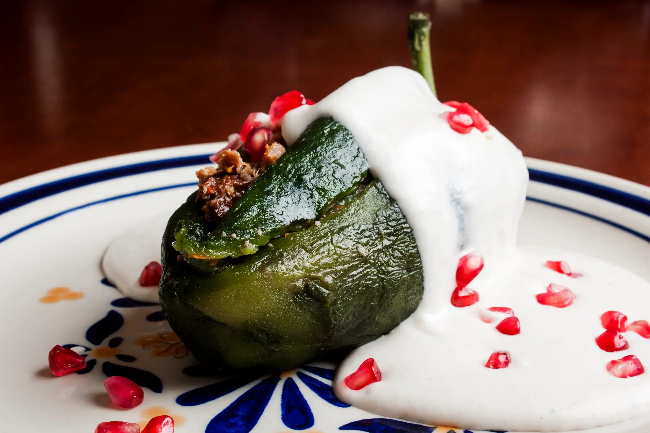 Chiles en Nogada ist eines der saisonalen Spezialitäten, das nur während der Granatapfel- und Walnusszeit von August bis September serviert wird. Dieses mexikanische Gericht besteht aus einer gerösteten Poblano-Paprika, die mit Picadillo, einer mit Zimt und Rosinen gewürzten Hackfleischfüllung, gefüllt ist.