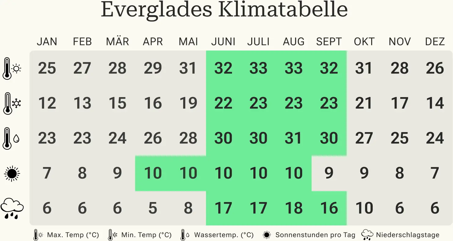 In der Tabelle sind Durchschnittswerte dargestellt, die auf den Klimadaten von Miami, Orlando, Key West und den Everglades basieren.