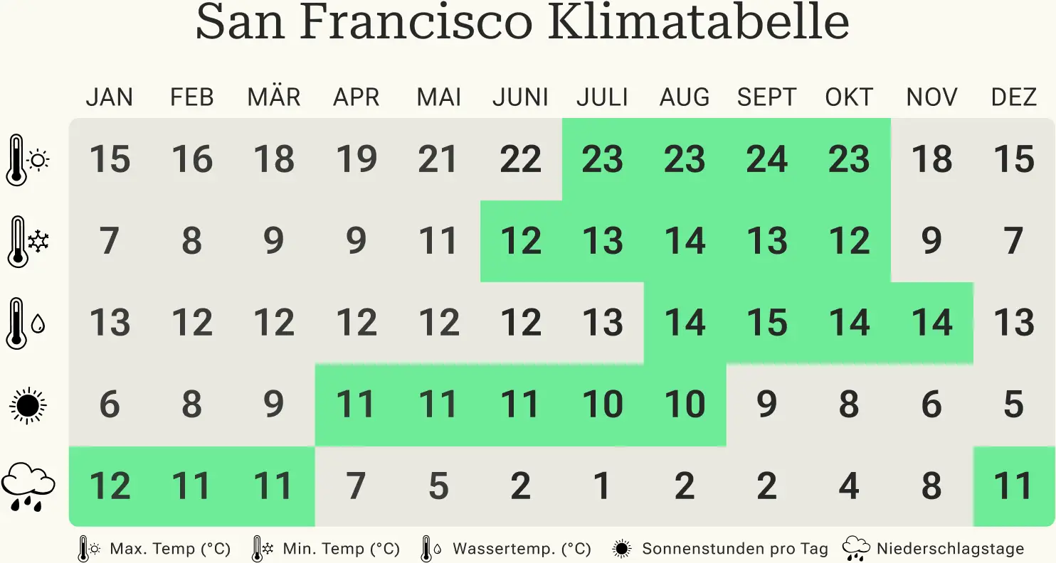 | Westküste - Süden | Kalifornien | Juni-August | April-Mai & September-November | Dezember-März |