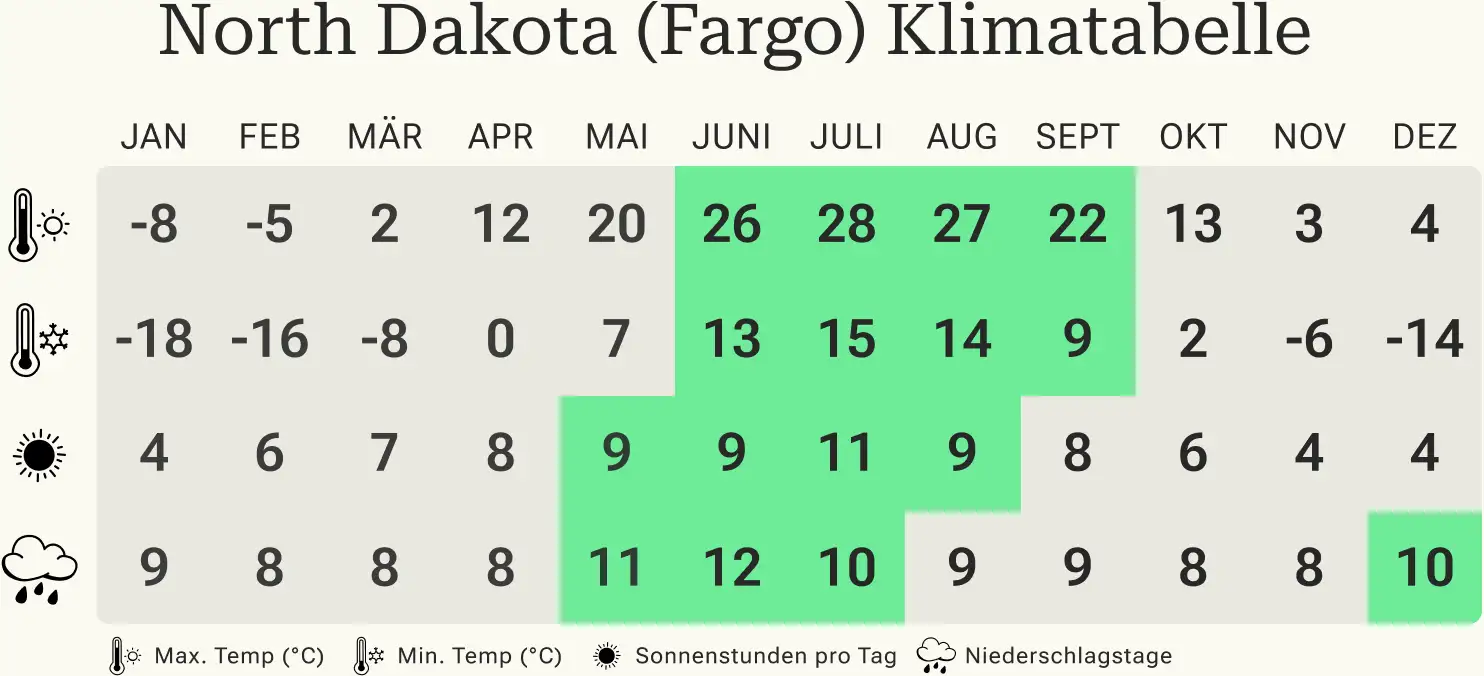 Als beste Reisezeit gelten die Monate Juni bis August. Jetzt laden sommerliche Temperaturen zwischen 15 und 28° C, lange Sonnenstunden und lediglich vereinzelte Schauer dazu ein, die herrliche Natur hautnah zu erleben oder einen spannenden Städtetrip nach Fargo zu unternehmen. Wer die Region hingegen in der Nebensaison erkunden möchte, profitiert zwischen April und Mai von fantastischem Frühlingswetter. Oder Sie reisen im Herbst, um die einzigartigen Farben des Indian Summers zu bestaunen. Bis November bleibt es dabei tagsüber weiter warm. Nachts sinken die Temperaturen aber bereits merklich.