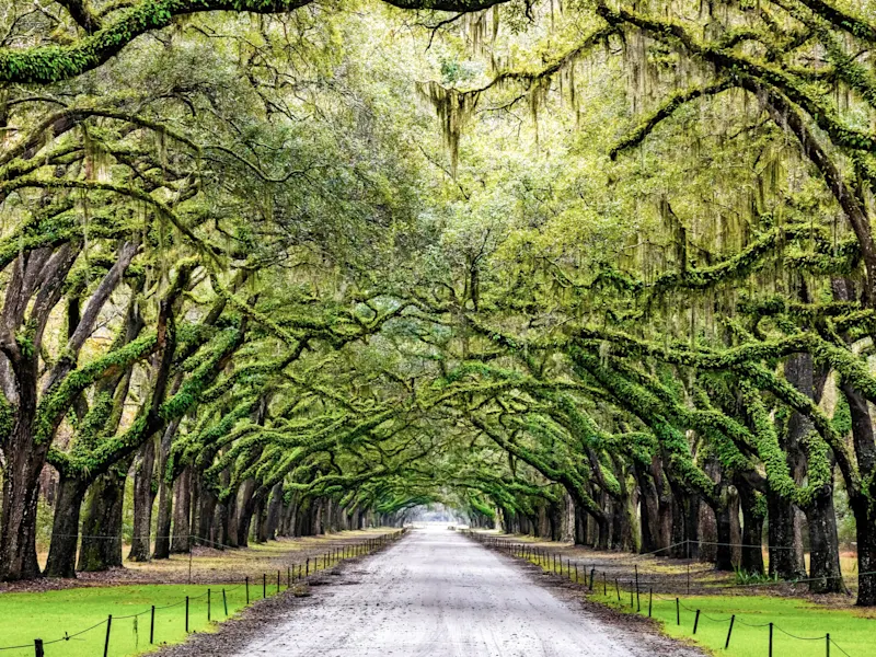 Wunderschöne Allee mit alten Eichen und spanischem Moos