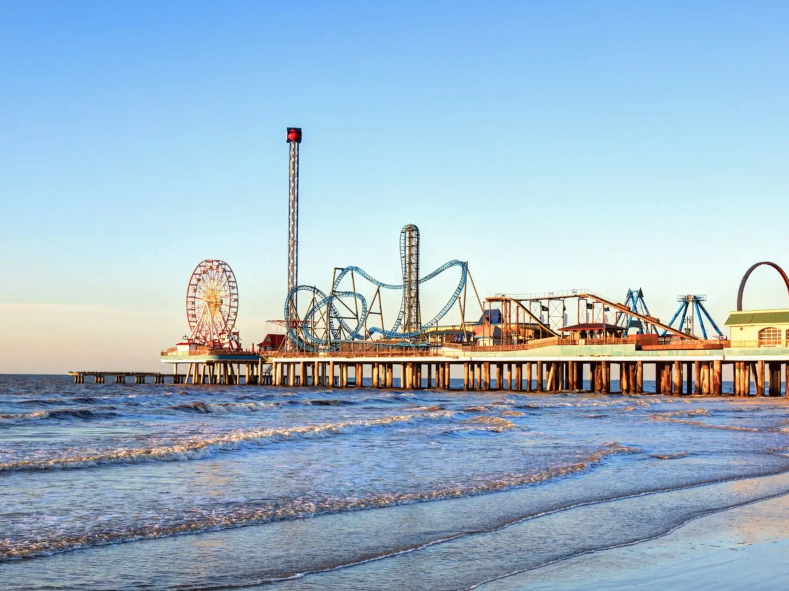 Südlich von Houston am Golf von Mexiko liegt die Stadt Galveston auf einer der Küste vorgelagerten, schmalen Insel. Die kleine Stadt ist bekannt für ihre historische Altstadt und weitläufige Strände. An der Promenade finden Besucher den Pier mit Vergnügungspark, der besonders bei Familien beliebt ist. Eine Achterbahn, ein Riesenrad und zahlreiche Fahrgeschäfte lassen hier die Herzen von Kindern höherschlagen.