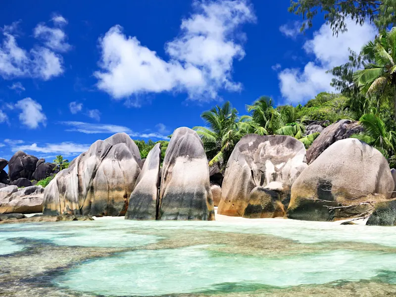 Anse Source d’Argent ist mit seinem goldenen Sand, den Palmen und den außergewöhnlichen Granitformationen ein Strand wie aus dem Bilderbuch. Durch das schützende Korallenriff ist das Wasser recht flach und ruhig, so dass der Anse Source d’Argent als besonders familienfreundlicher Strand gilt.