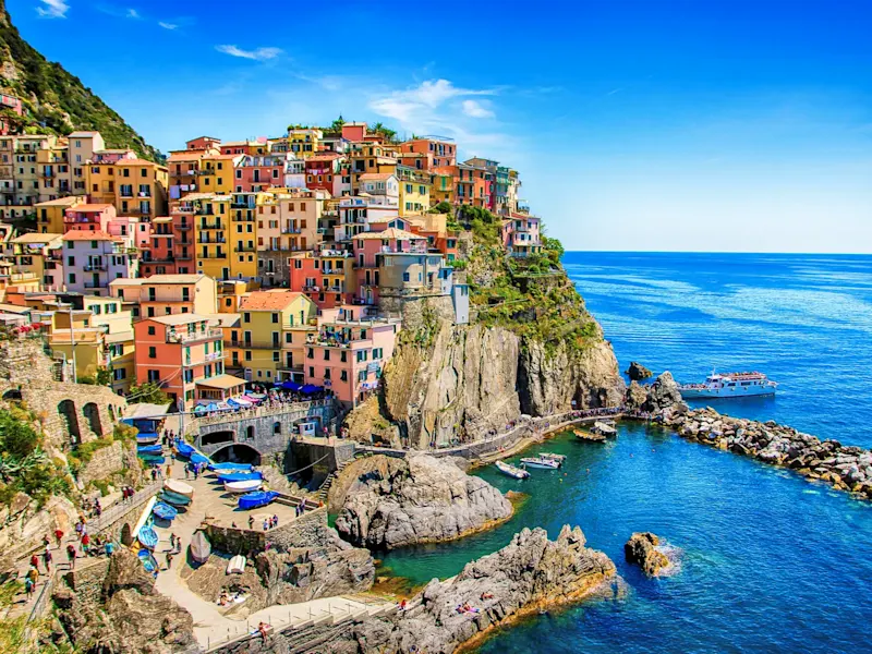 Erleben Sie die romantische Atmosphäre der Cinque Terre bei einem Besuch in der kleinen Ortschaft Manarola. Lassen Sie hier die kunterbunten Häuserfassaden auf sich wirken und genießen Sie den atemberaubenden Blick über die Klippen auf das türkisblaue Meer.