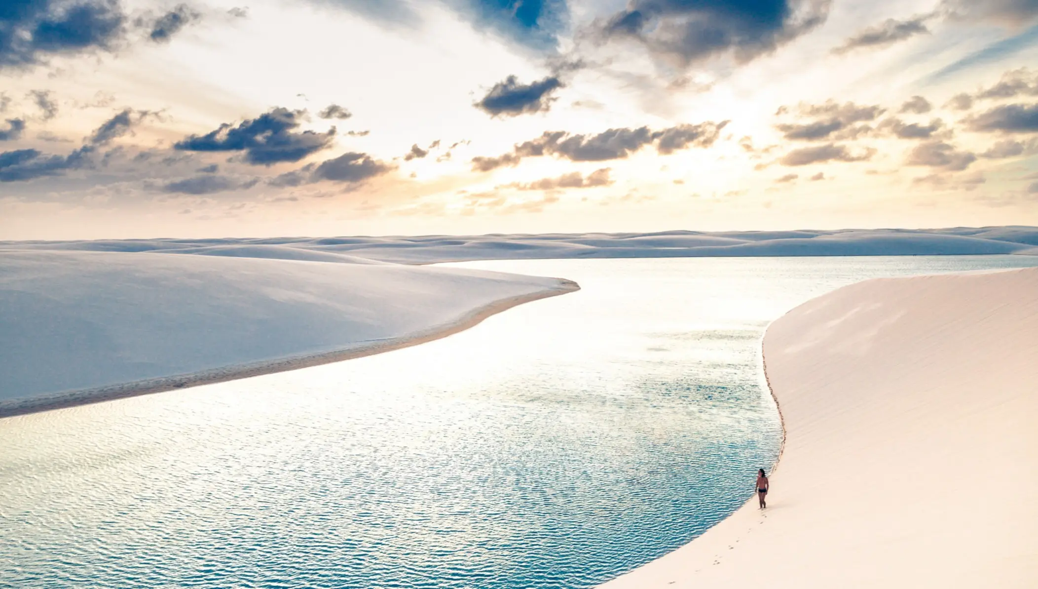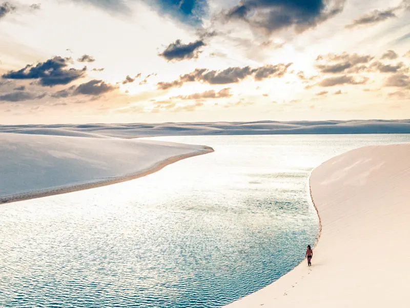 Brasiliens Strände sind so vielfältig wie das riesige Land selbst. Dennoch stellt der Strand von Lençóis Maranhenses im gleichnamigen Nationalpark etwas ganz besonderes dar. Denn mitten im tropischen Regenwald erschließt sich wie aus dem Nichts eine wüstenähnliche Landschaften voller schimmernder Lagunen.