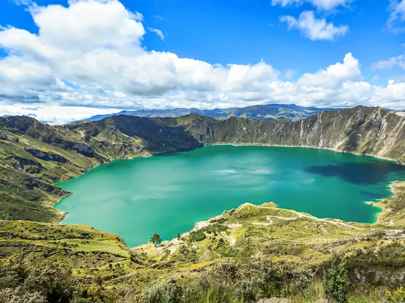 Der Quilotoa ist der westlichste Vulkan der ecuadorianischen Anden und zählt zu den beliebtesten Fotomotiven bei einer Reise durch das südamerikanische Land. Am eindrucksvollsten präsentiert sich der Kratersee an einem sonnigen Tag, wenn sich vereinzelte Wolken in dem türkisfarbenen See spiegeln. Die intensiv-leuchtende Farbe stammt von Mineralien. Man vermutet, dass der letzte Ausbruch des Vulkans auf das Jahr 1280 zu datieren ist. Besonders beliebt bei einem Ausflug zum Quilotoa ist eine etwa 5-stündige Wanderung um die Caldera oder eine Tour zum See hinab.