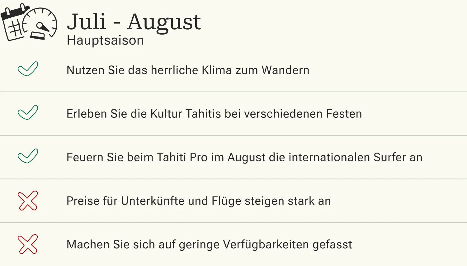 Die Hochsaison auf Tahiti reicht von Anfang Juli bis Ende August. Während dieser Monate zieht es vermehrt internationale Touristen auf die Vulkaninsel, sodass Preise für Flüge, Unterkünfte und Aktivitäten deutlich steigen. Doch dafür schaffen lange Sonnenstunden, wenig Niederschlag und eine geringe Luftfeuchtigkeit ideale Reisebedingungen für einen unvergesslichen Inselurlaub. Wer rechtzeitig bucht, kann Tahiti zu dieser Zeit wunderbar auf Wander- oder Schnorcheltouren erkunden. Alternativ bieten kulturelle Feste wie das Heiva i Tahiti einen fantastischen Einblick in die lokale Kultur. Oder Sie staunen im August, wie die besten Surfer der Welt beim Tahiti Pro die Welle von Teahupoo reiten.