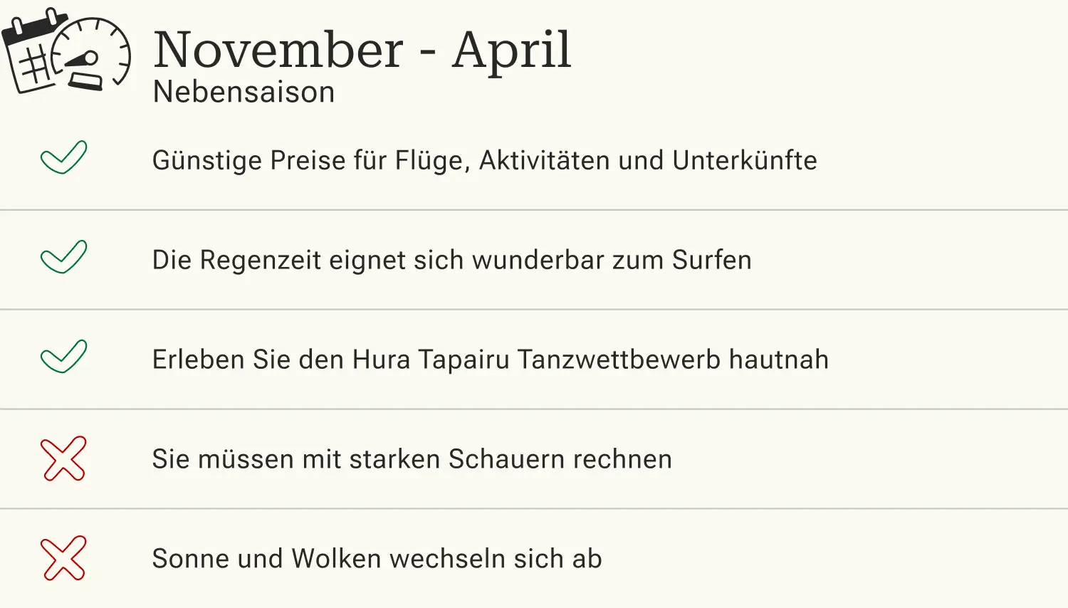 Zwischen November und April wird es auf Tahiti ruhiger. Teils starke Regenschauer, viele Wolken und eine vergleichsweise hohe Luftfeuchtigkeit stehen an der Tagesordnung. Dennoch lohnt sich ein Besuch zu dieser Jahreszeit für einen Tauchurlaub oder zum Wellenreiten. Entdecken Sie die faszinierende Unterwasserwelt auf einem geführten Tauchgang bei angenehmen Wassertemperaturen um die 27° C. Oder stellen Sie Ihr Können beim Surfen vor der Küste der Insel unter Beweis. Wer Tahiti mit einem begrenzten Reisebudget erkunden möchte, profitiert jetzt von günstigen Preisen und lohnenden Angeboten.