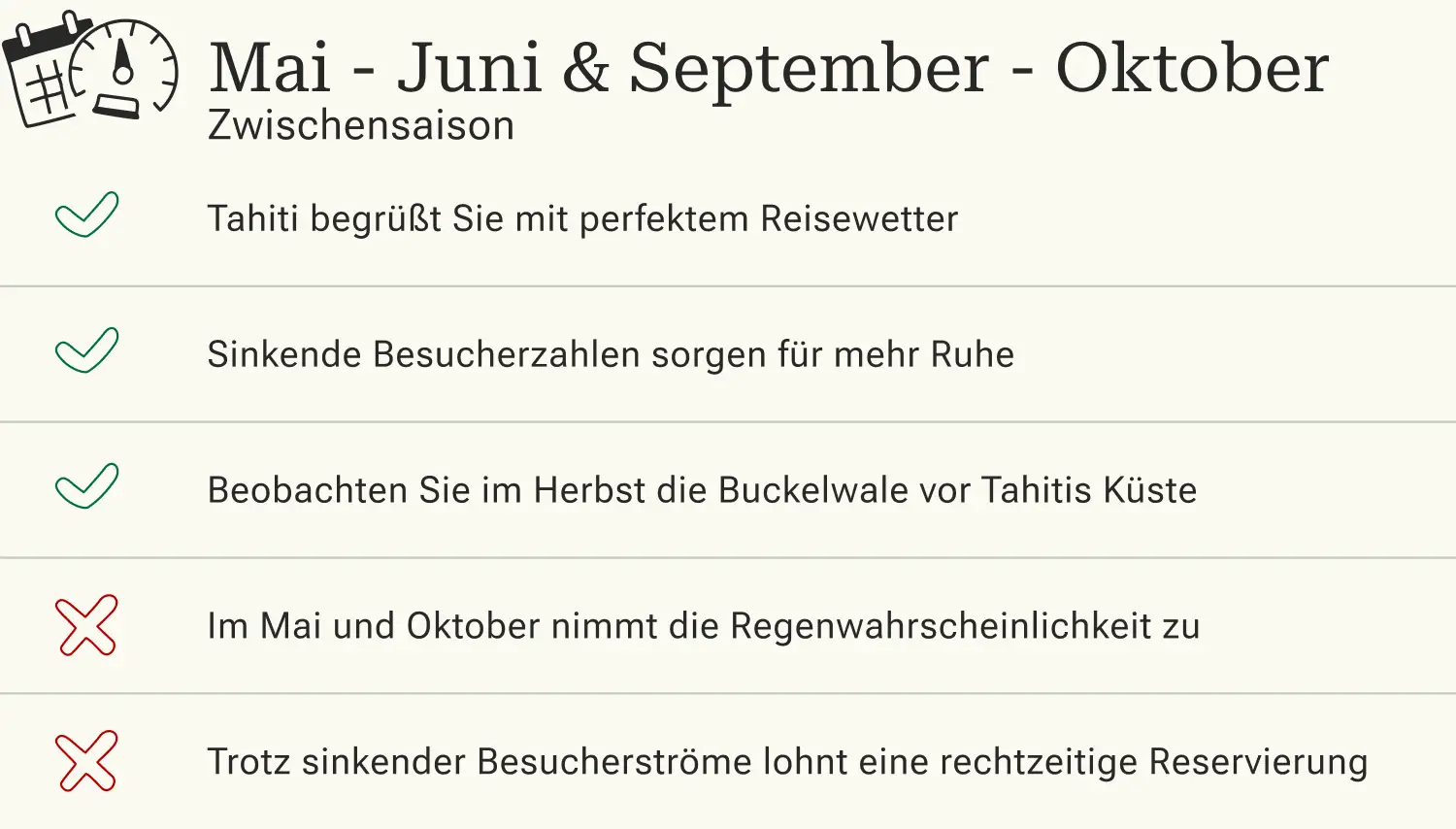 Sowohl im Mai und Juni als auch im September und Oktober erwartet Tahiti seine Besucher mit strahlendem Sonnenschein, angenehmen Temperaturen bis zu 27° C sowie lediglich vereinzelten Schauern. Im Gegensatz zur Hochsaison sind die Preise für Flüge, Unterkünfte und Aktivitäten auf der Insel erschwinglich und noch dazu können Sie die malerischen Landschaften Tahitis in aller Ruhe genießen. Nicht zuletzt werden in diesen Monaten diverse Feste und Veranstaltungen auf der Vulkaninsel gefeiert, die Sie sich nicht entgehen lassen sollten.